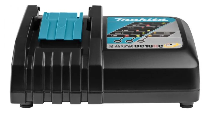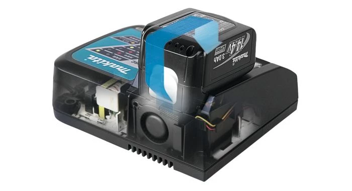Le DC18RC est équipé d’un ventilateur de refroidissement et des commandes Active 3. Le système de refroidissement souffle de l’air de refroidissement dans la batterie. Cela signifie que la tension de charge, le courant de charge et la température sont surveillés pendant la charge.